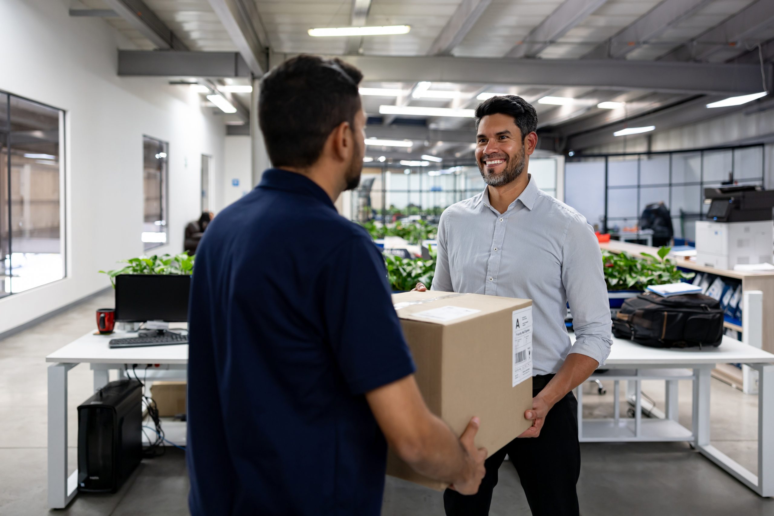 Happy businessman sending a package using a currier service from his office - Mail handling